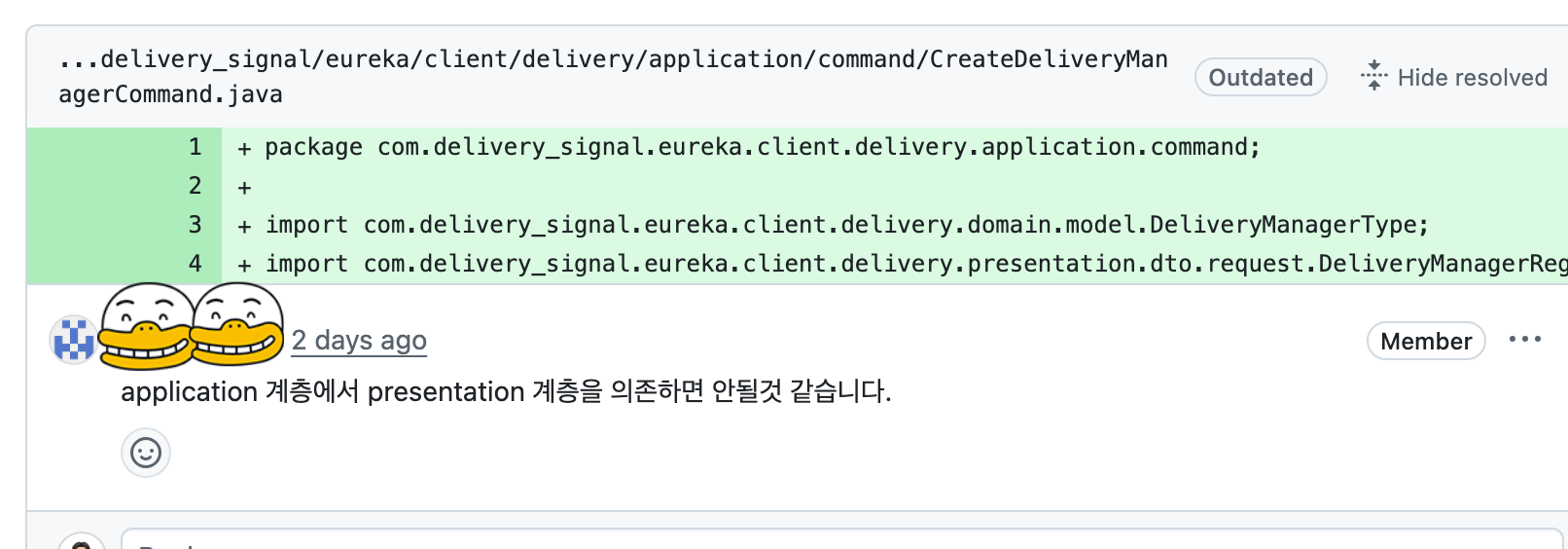 application 계층인 CreateDeliveryCommand에서 presentation 계층인 DeliveryManagerRequest를 역으로 의존하고 있다는 말이다. (command는 CQRS의 조회/쓰기 모델 분리 개념이다. 해당 프로젝트에서는 application 계층에서 command와 query DTO를 분리하여 CQRS 스타일의 조회 로직을 구성하였다.)