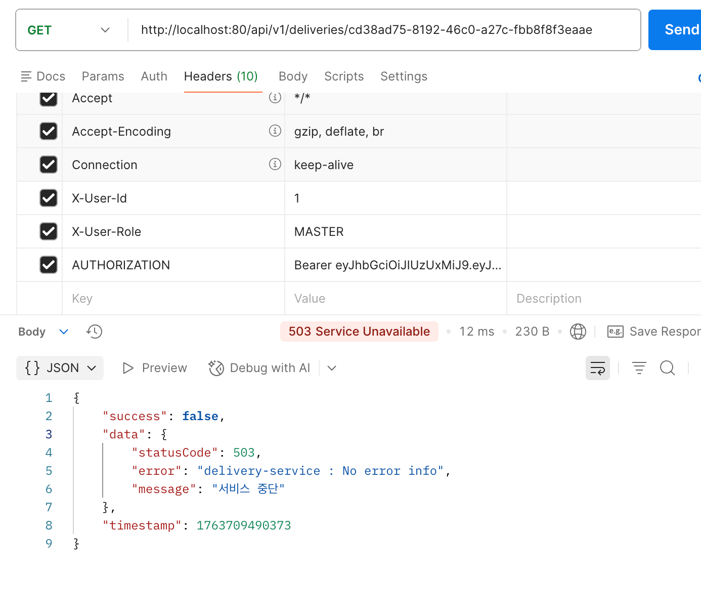 요청 실패를 유도하려면 먼저 delivery-service가 실패하여 Gateway의 실패율 임계치(failureRateThreshold: 50)를 초과하게 만들어야 한다.