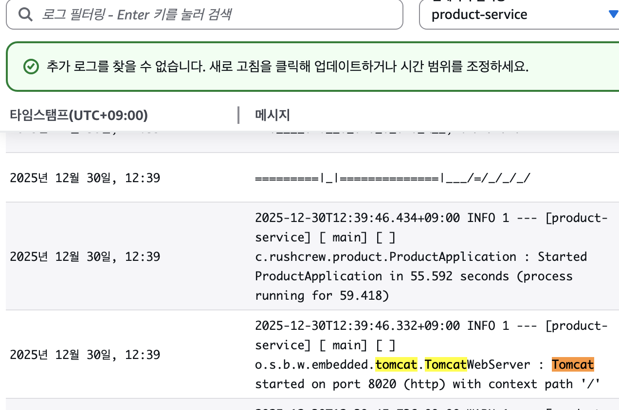 Cloudwatch에서 로그 봤을 때, product-service라는 ecs 서비스는 정상적으로 돌아가는 상황임을 알 수 있다.