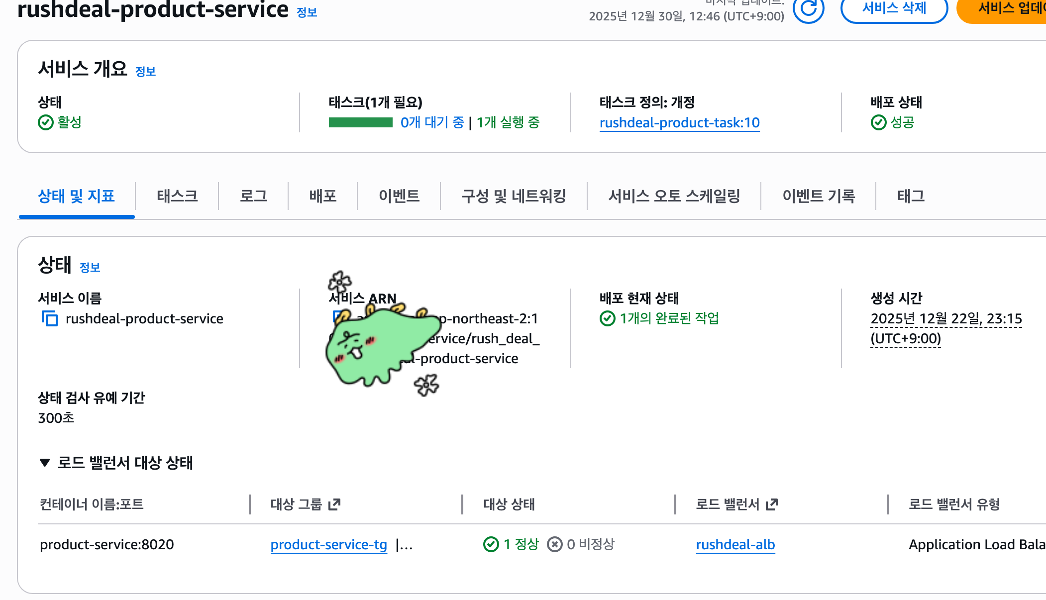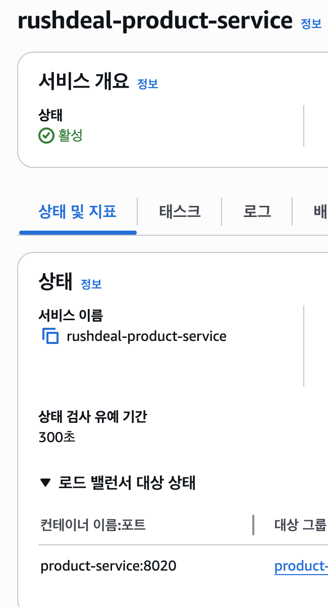 1. ECS 클러스터(rush_deal_msa) > 서비스(Services) 탭 > rushdeal-payment-service 클릭.