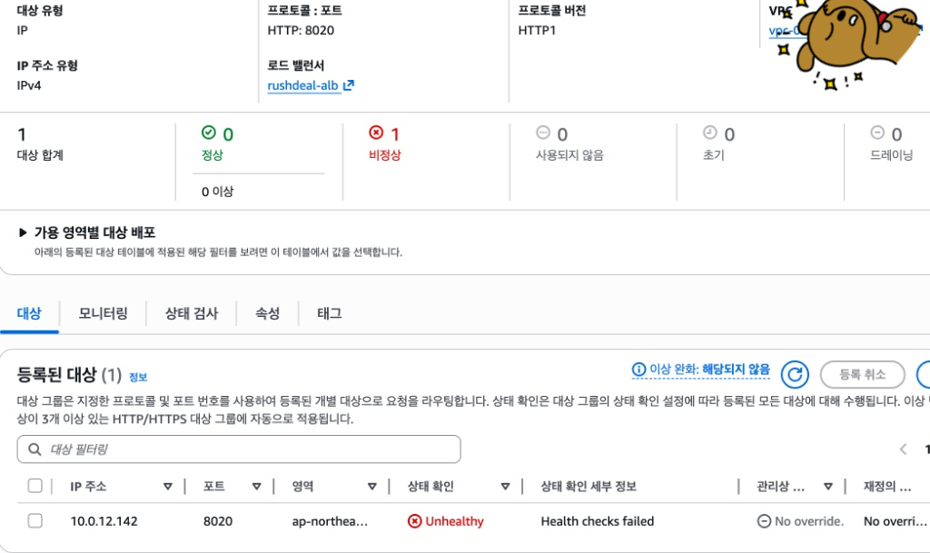 위와 같이 등록된 대상이 "Unhealthy" 상태로 뜨고, 헬스 체크가 실패했다는 메시지가 표시됨.