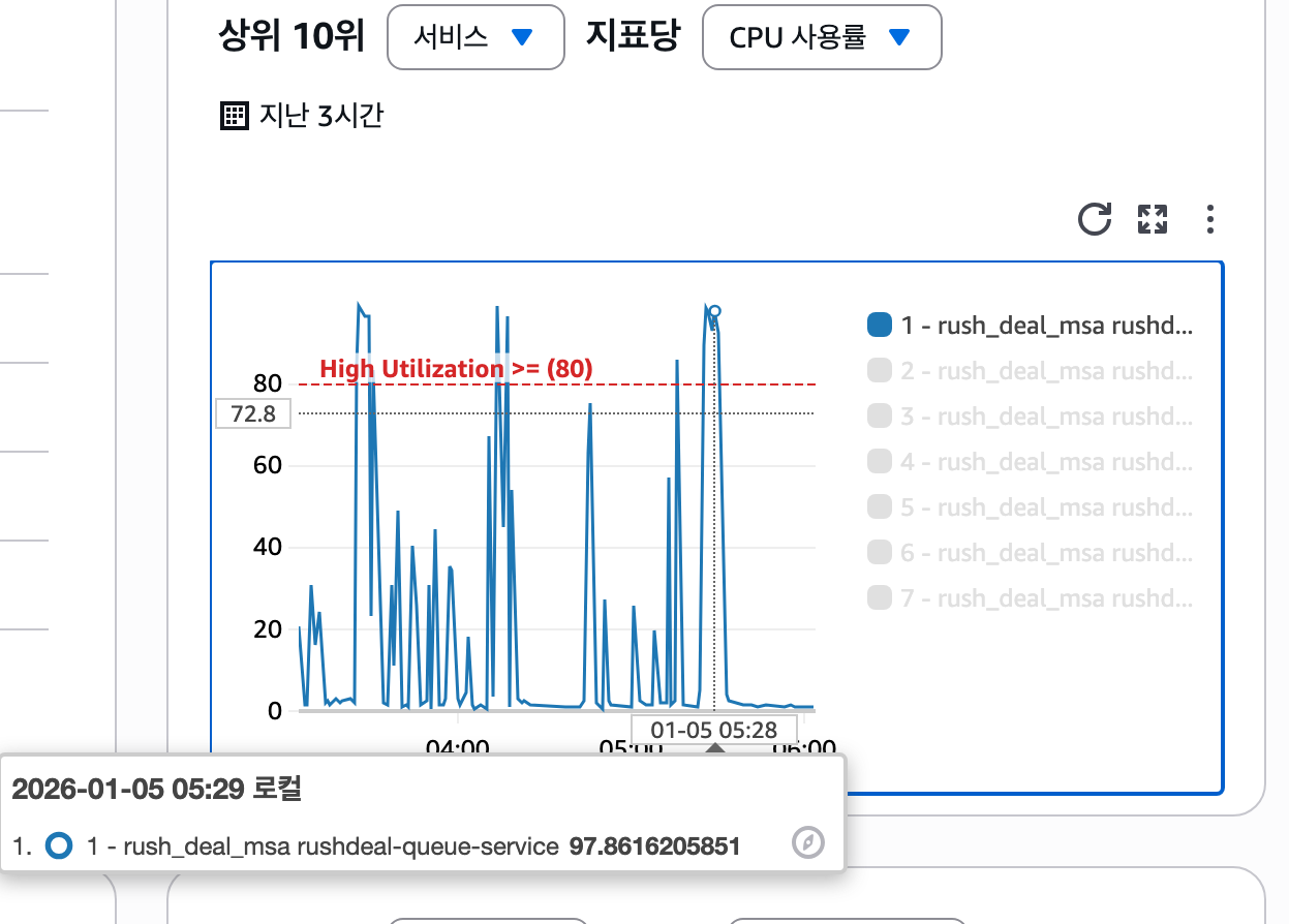 - 해석: 1,000명의 유저가 동시에 몰리자, 단일 태스크(서버 1대)였던 서버(Task)가 처리 한계에 도달하여 CPU가 포화 상태가 되었다. 이 상태가 지속되면 서버 다운(502 Bad Gateway)이나 응답 지연이 발생할 수 있다.