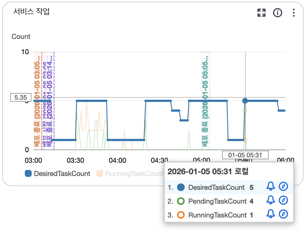 - 주황선 (RunningTaskCount): 실제로 컨테이너가 하나둘씩 켜지면서 1개에서 5개로 실행 중인 서버가 늘어남.