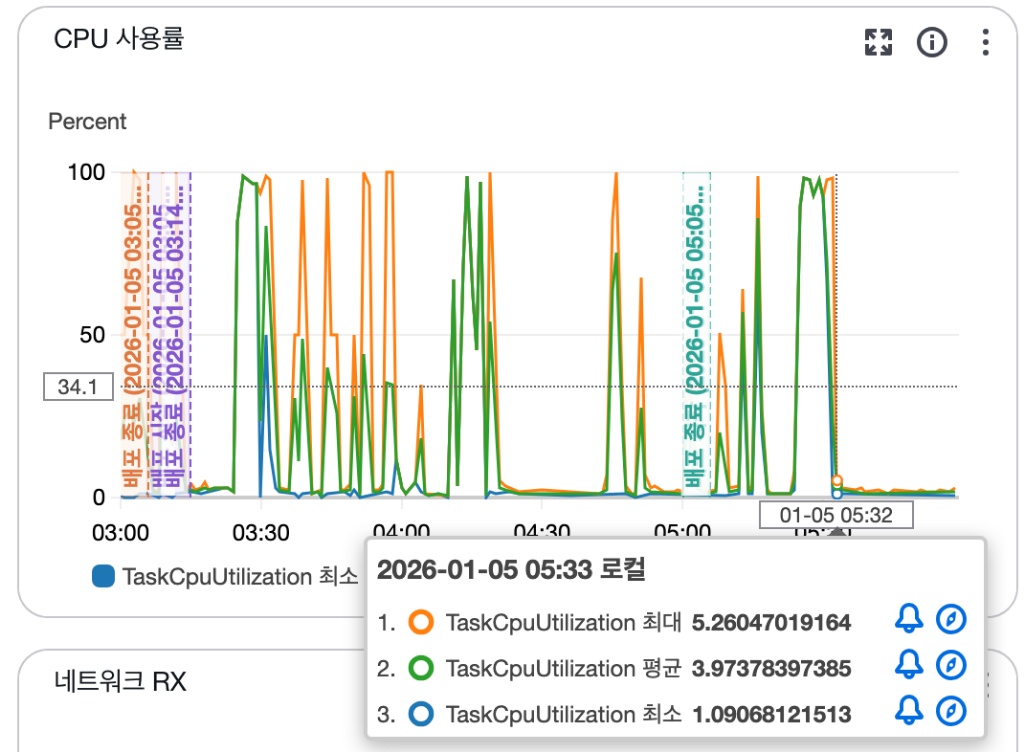 - 현상: TaskCpuUtilization 최대값이 98.01% 까지 치솟음.
