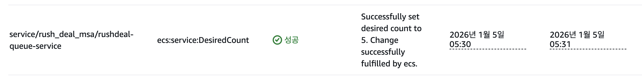 CPU 알람을 감지하고, ECS가 스스로 Desired Count를 5로 변경하여 대응했음을 확인할 수 있다.