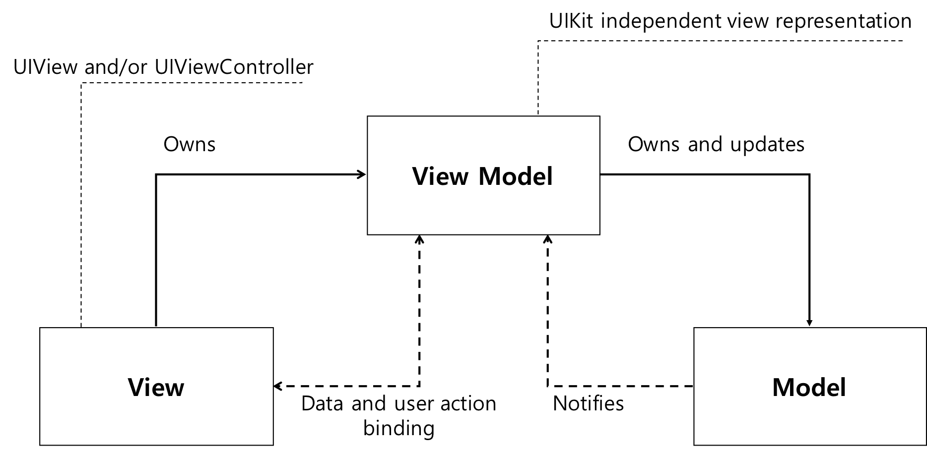- View Model은 중계자 역할. 뷰와 뷰 컨트롤러 사이에서 커뮤니케이션 역할을 한다.