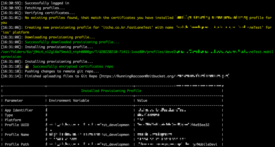 키체인 비밀번호가 정상적으로 입력되었다면 해당 프로젝트 APP ID의 새로운 Provisioning Profile을 새로 생성하여 다운받습니다. 이후 certificates repo가 정상적으로 암호화되어 Matchfile에 연동해둔 깃 리포지토리에 push를 합니다.
