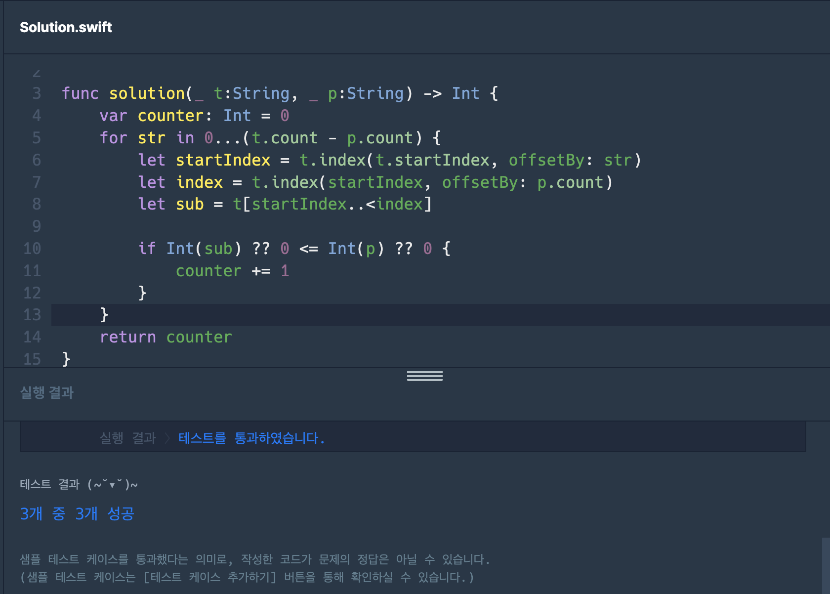 숫자로 이루어진 문자열 t와 p가 주어질 때, t에서 p와 길이가 같은 부분문자열 중에서, 이 부분문자열이 나타내는 수가 p가 나타내는 수보다 작거나 같은 것이 나오는 횟수를 return하는 함수 solution을 완성하세요.