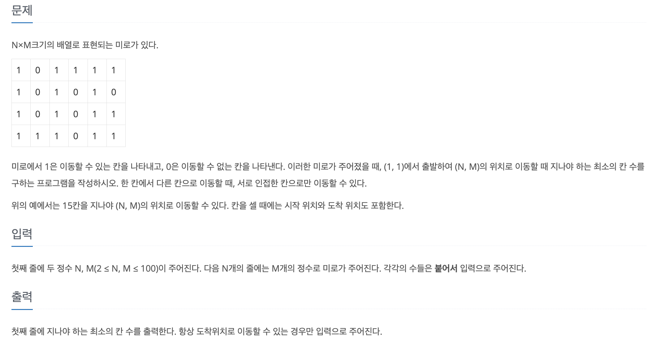 직관적으로 보았을 때, 현재 셀을 기준으로 상하좌우로 이동하며 가능한 경로를 탐색하기 때문에 DFS나 BFS로 해결가능한 문제이다. 방문 조건 중 하나로 1인 칸으로만 이동이 가능하므로 1인 칸을 그래프에서의 하나의 노드로 볼 수 있기 때문이다. 다만 DFS로 풀었을 경우, 재귀적인 특성으로 인해 depth를 다루기가 까다롭다. 때문에 depth 대로 쭉 내려오는 것이 가능한 BFS를 사용하는 것이 더 간단한 풀이가 될 것으로 보인다. BFS는 해당 깊이에서 갈 수 있는 노드 탐색을 마친 후 바로 다음 깊이로 내려가는 식으로 동작하기 때문이다.