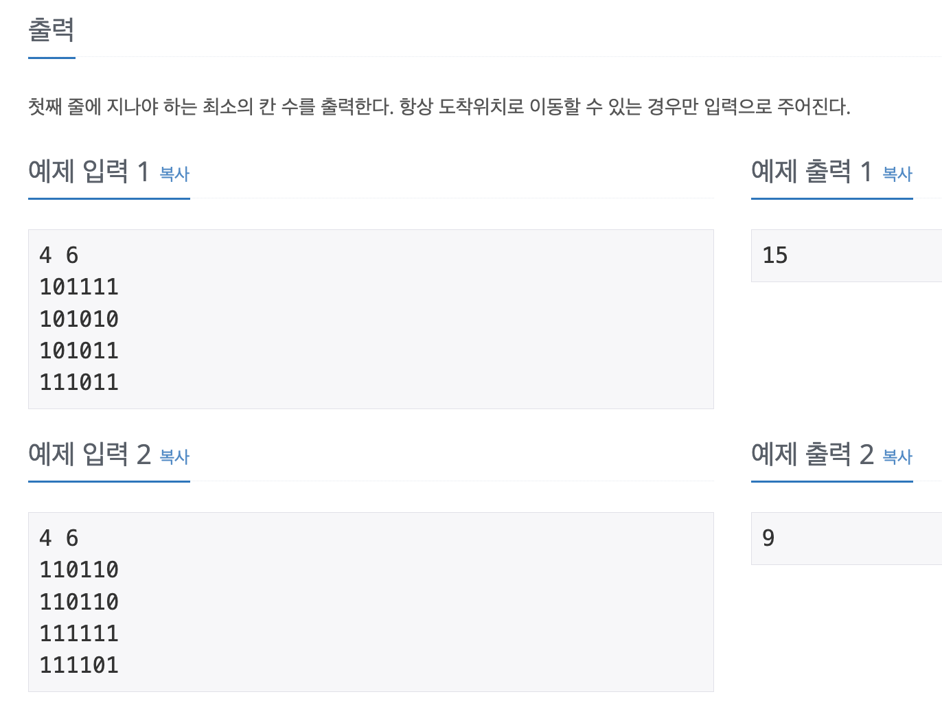 첫번째 출력 예시를 통해 예상되는 실행 결과를 확인해보았다. 시작점으로부터 출발하여 방문 가능한 셀들을 한 칸 씩 이동할때마다 1씩 증가시키고, 마지막 끝 점에 도달하면 최소 이동 칸 수를 반환한다.