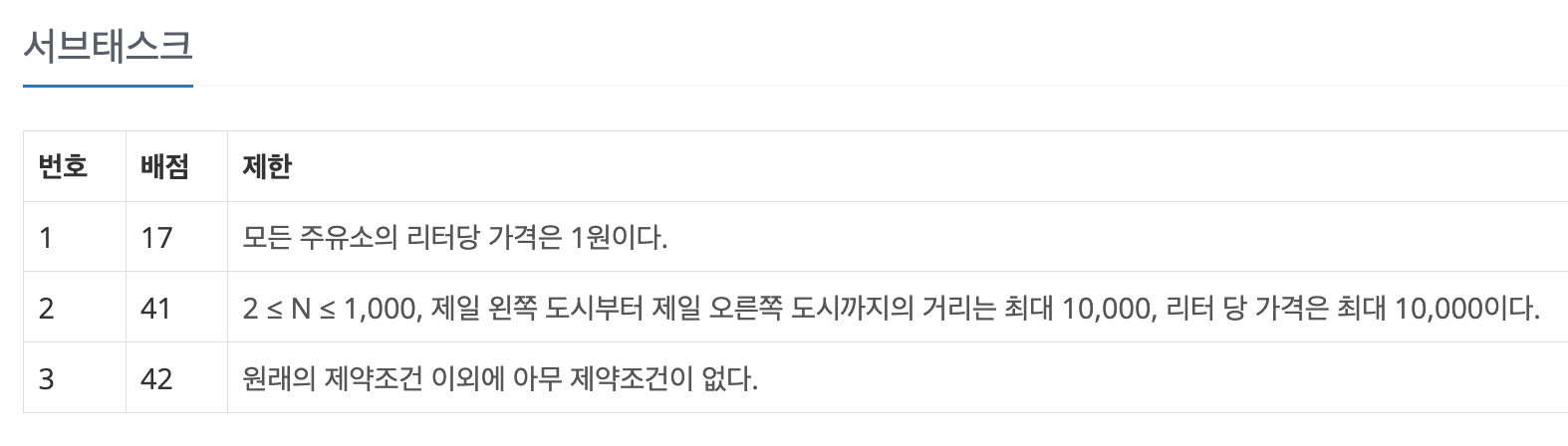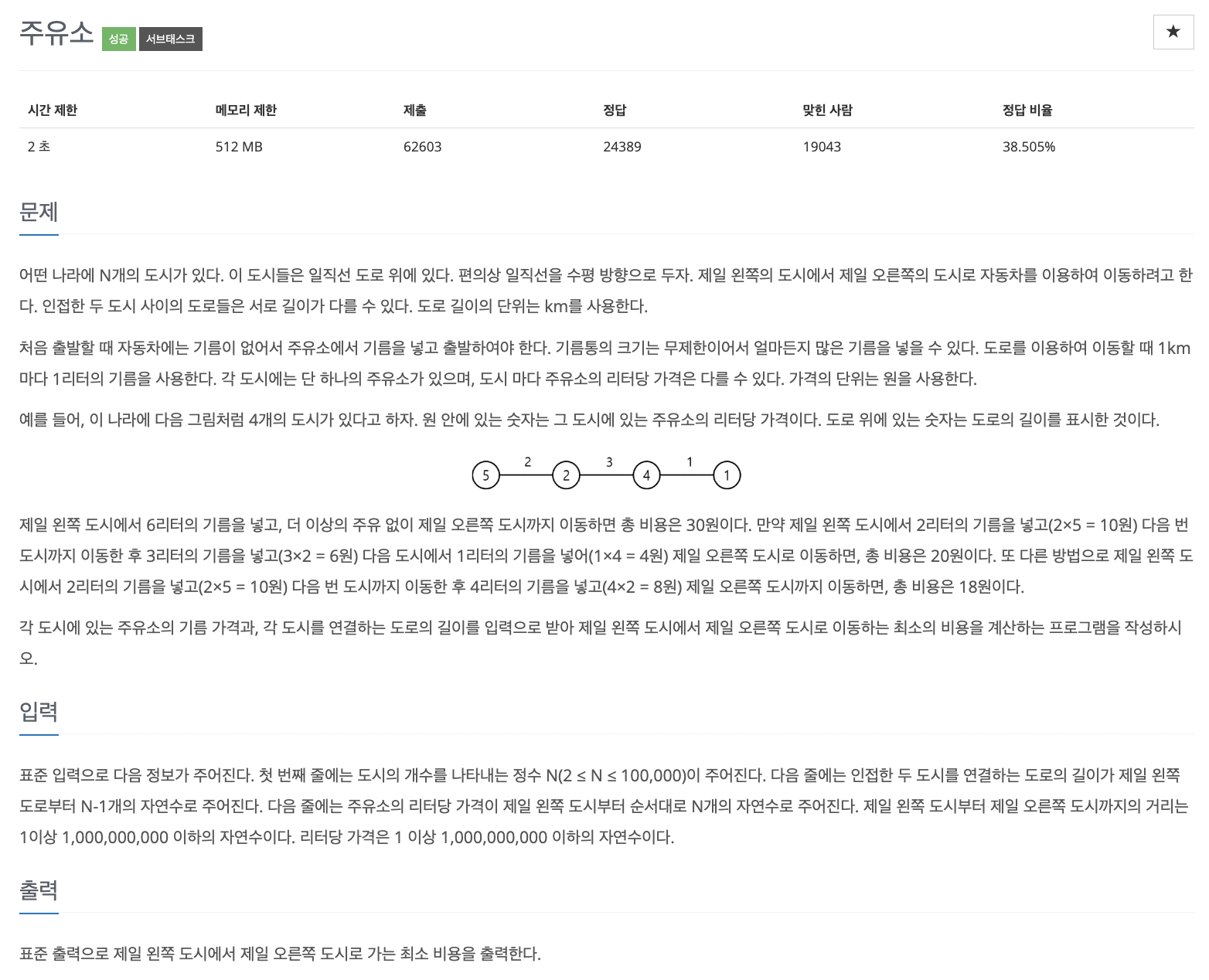 가격이 싼 도시의 주유소에서 많이 넣는 것이 주유비를 최소화할 수 있는 방법이나, 처음 출발 시에는 기름이 없으므로 무조건 첫 번째 도시에서 주유를 하고 가야한다. 다음 도시의 주유소를 이용하는 것이 불가하기 때문에 현재 선택지에서 최선의 선택을 하는 Greedy 알고리즘을 적용하는 것이 하나의 방법이 될 수 있는 것으로 보인다.