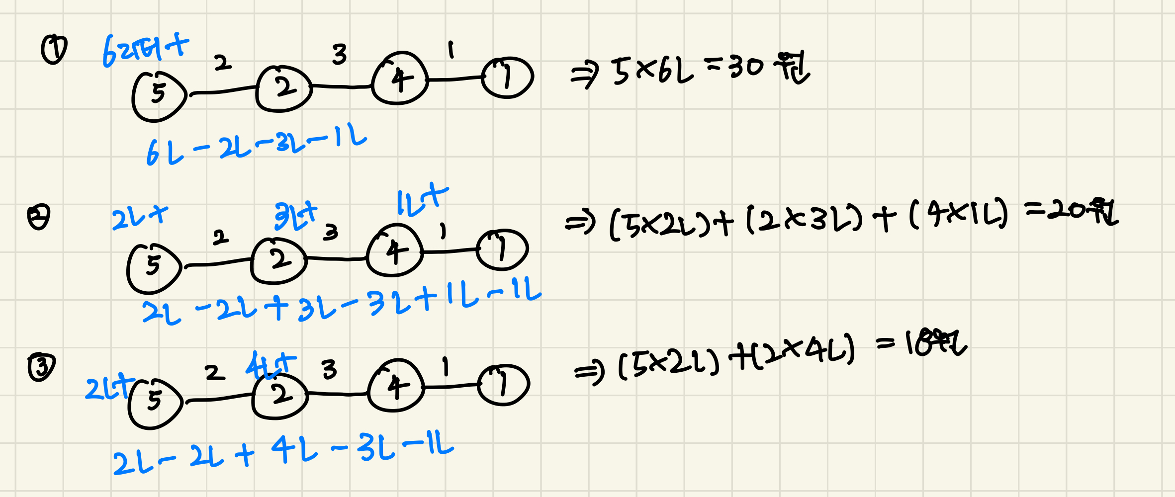 왼쪽 도시에서 오른쪽 도시로 이동하는 데에 드는 최소 주유비용을 구하는 과정을 정리해보았다.
