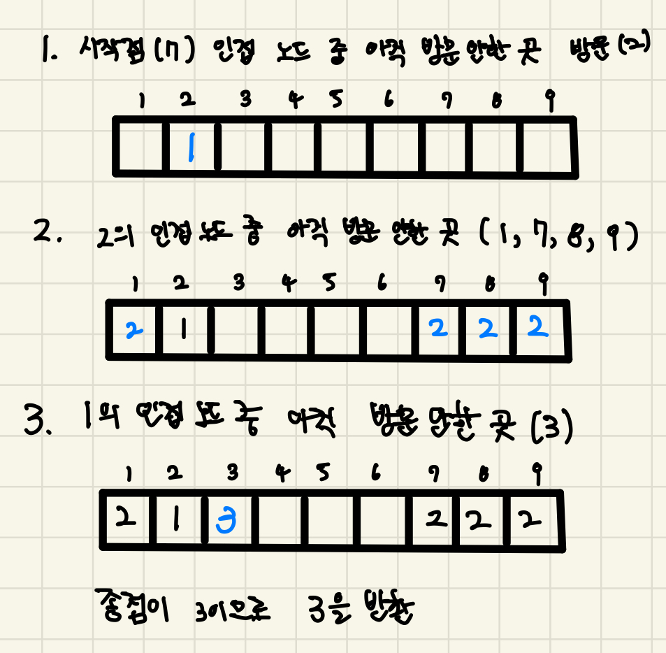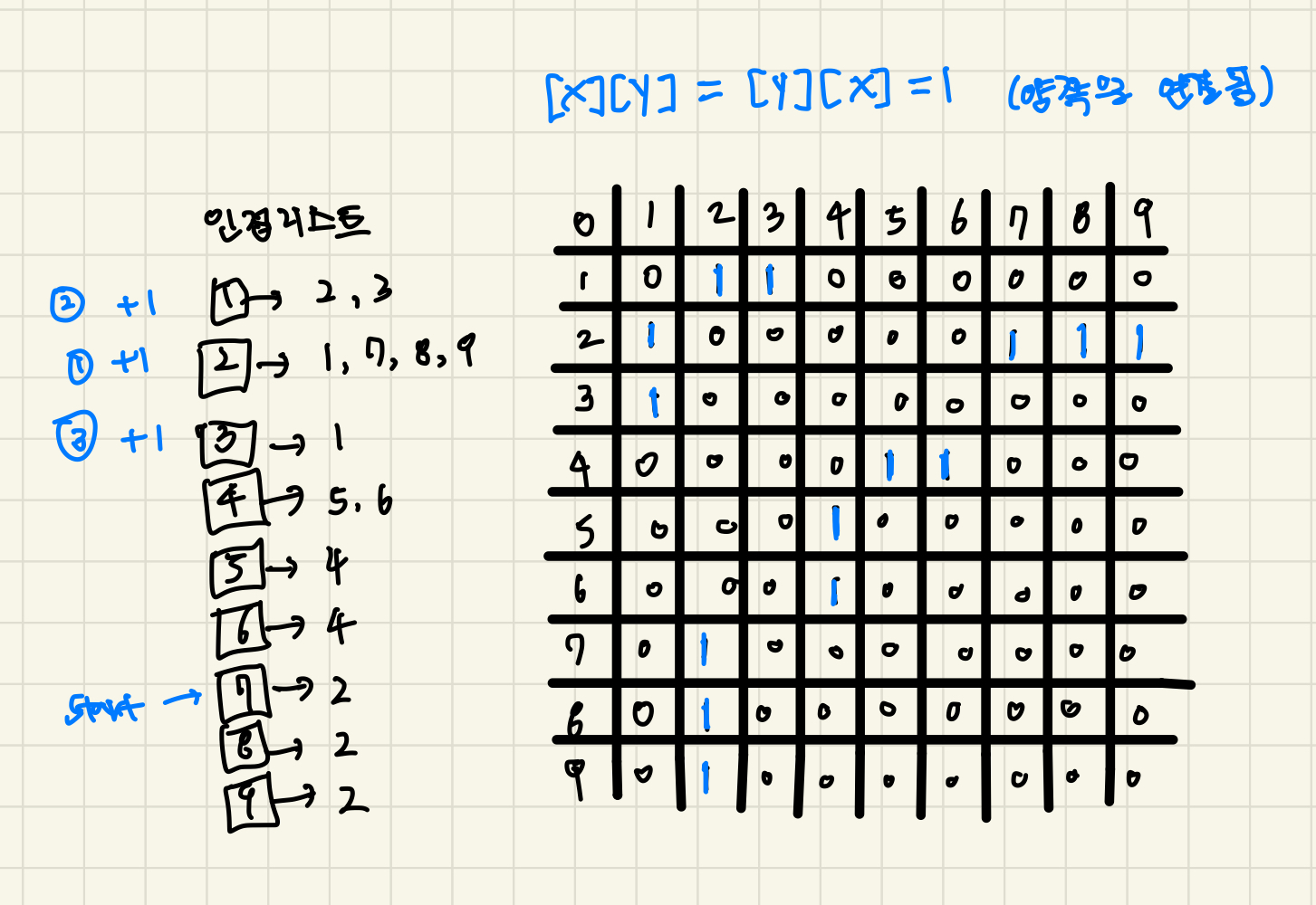 입력 예제를 바탕으로 그래프화 해본 결과, 최단 경로를 구하는 방식이나 깊이 우선 탐색을 이용하는 방법으로 풀이가 가능하다는 생각이 들었다. DFS & BFS 둘 다로 풀이할 수 있는 문제이므로 두 알고리즘을 각각 적용하여 풀이해보기로 했다.