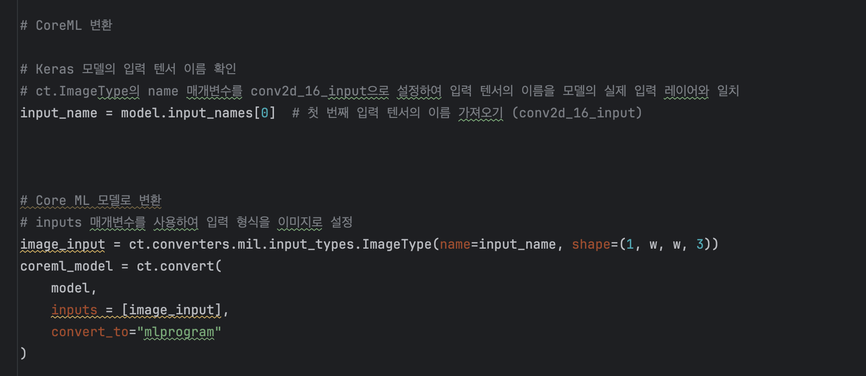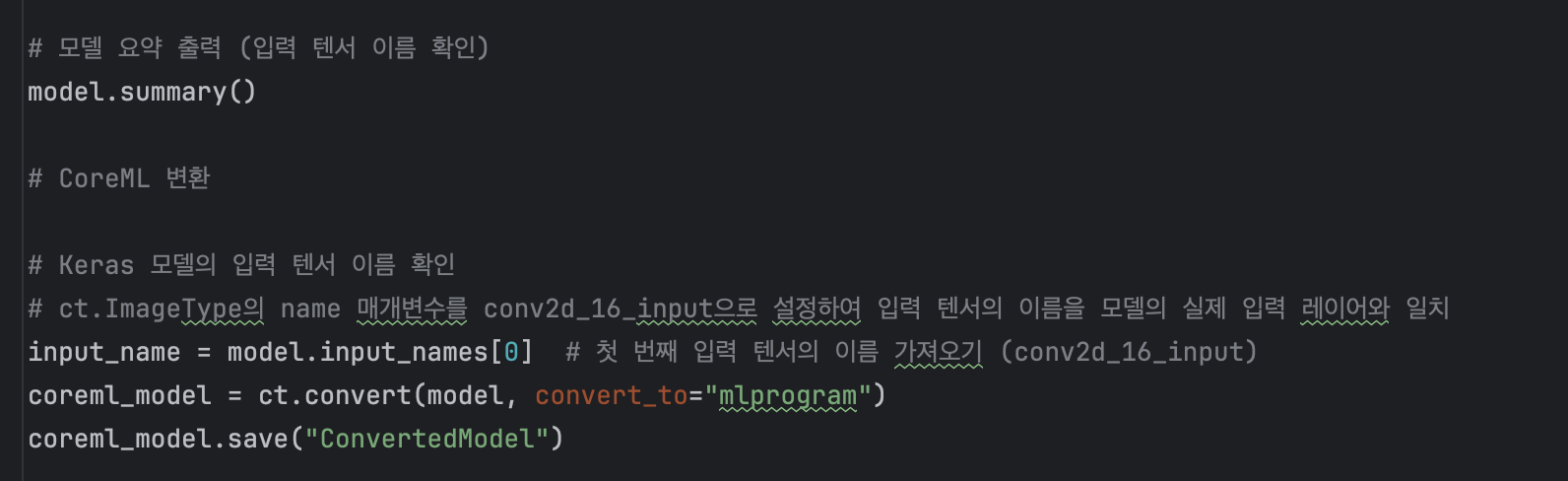 CoreML 모델로 변환 시 입력 텐서의 이름을 모델의 실제 입력 이름과 일치하게끔 수정했다.