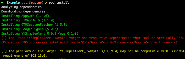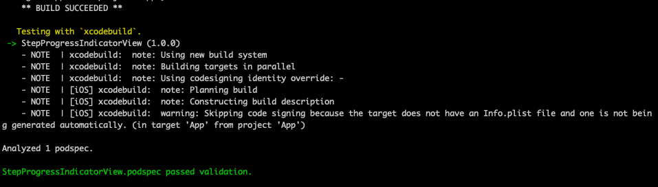 해당 명령어를 통해 .podspec 파일에 명시된 값들에 대한 유효성 검증이 진행된다.