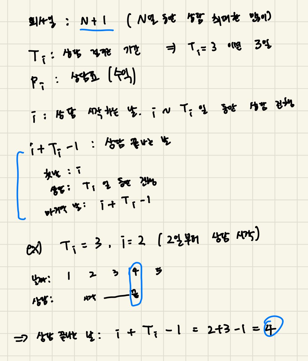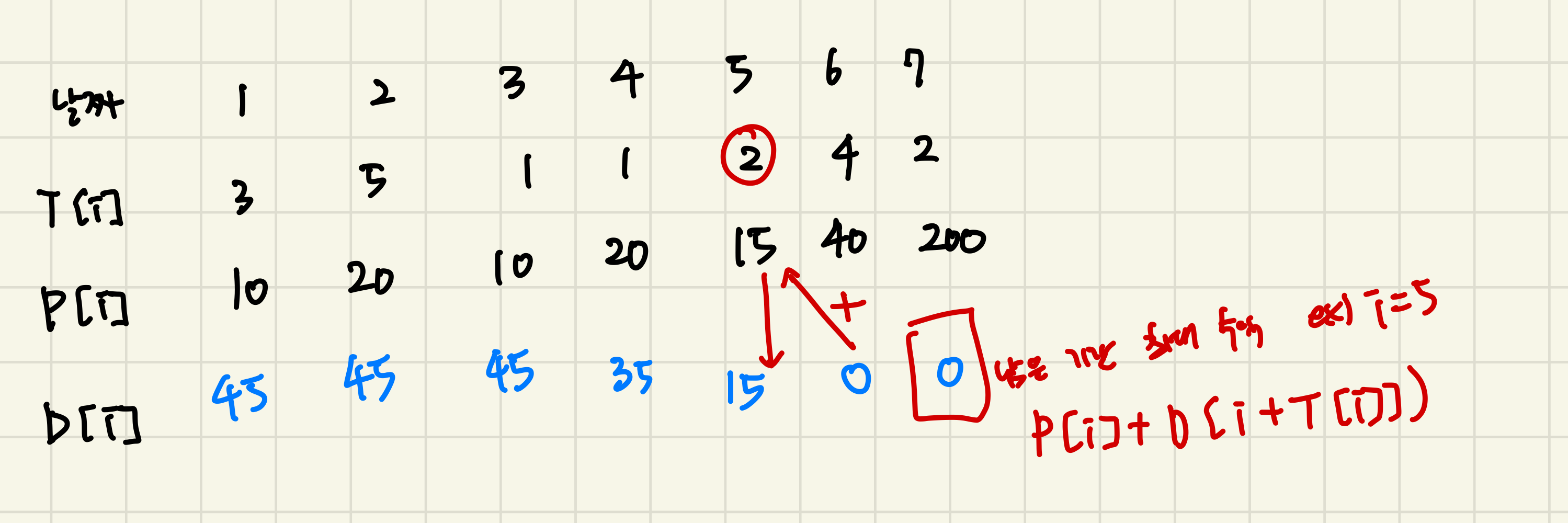 - i + T[i]일부터 남은 기간에 대해 최대 수익 D[i+T[i]]을 추가적으로 계산해야 함. (상담이 끝난 이후 남은 기간에 대한 최대 수익을 나타냄)