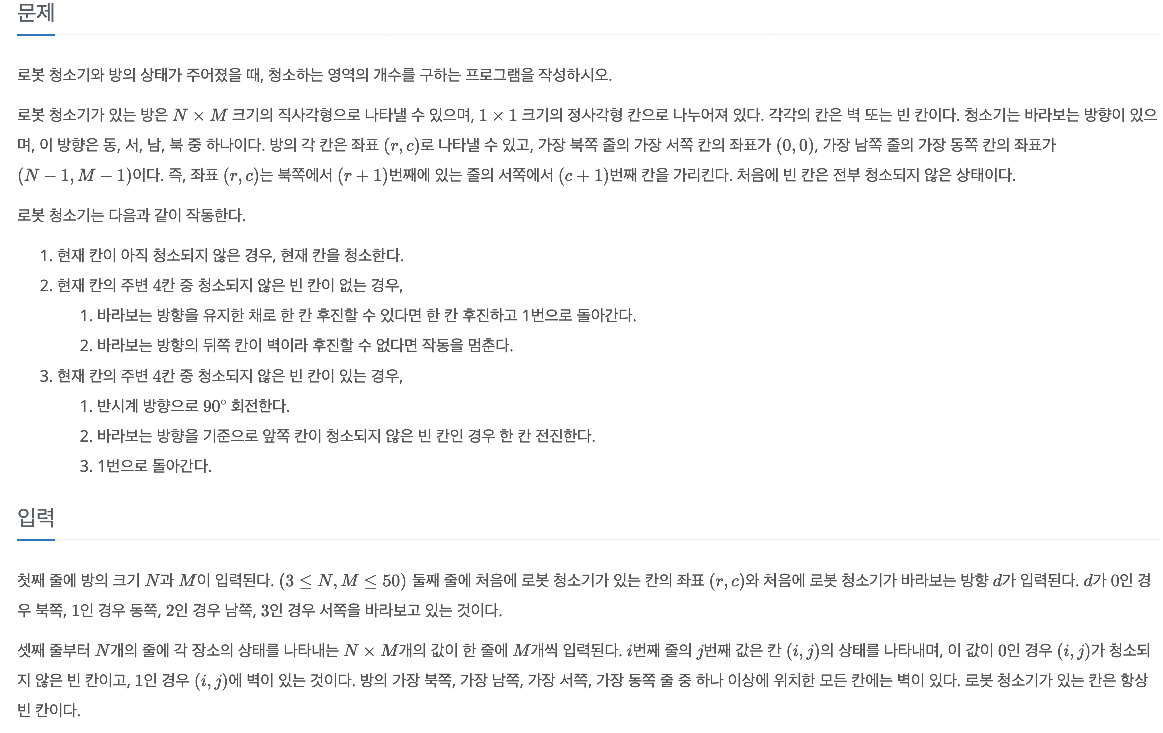 - 바라보는 방향 기준 앞쪽 칸이 청소되지 않은 경우, 한 칸 전진