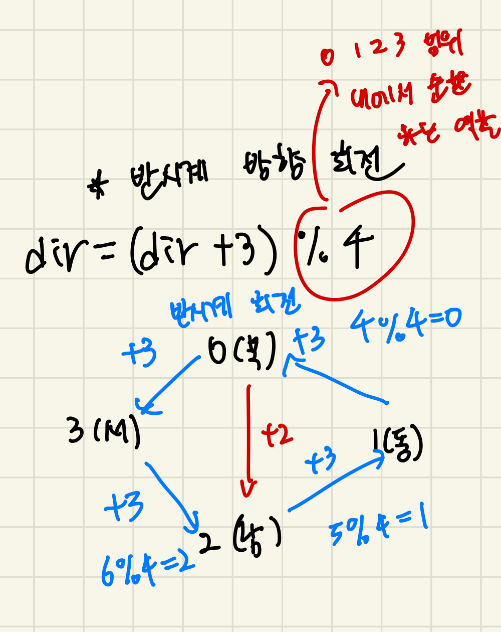 ex) 위 문제에서 주어진 방향값은 0(북), 3(서), 2(남), 1(동) 이다.