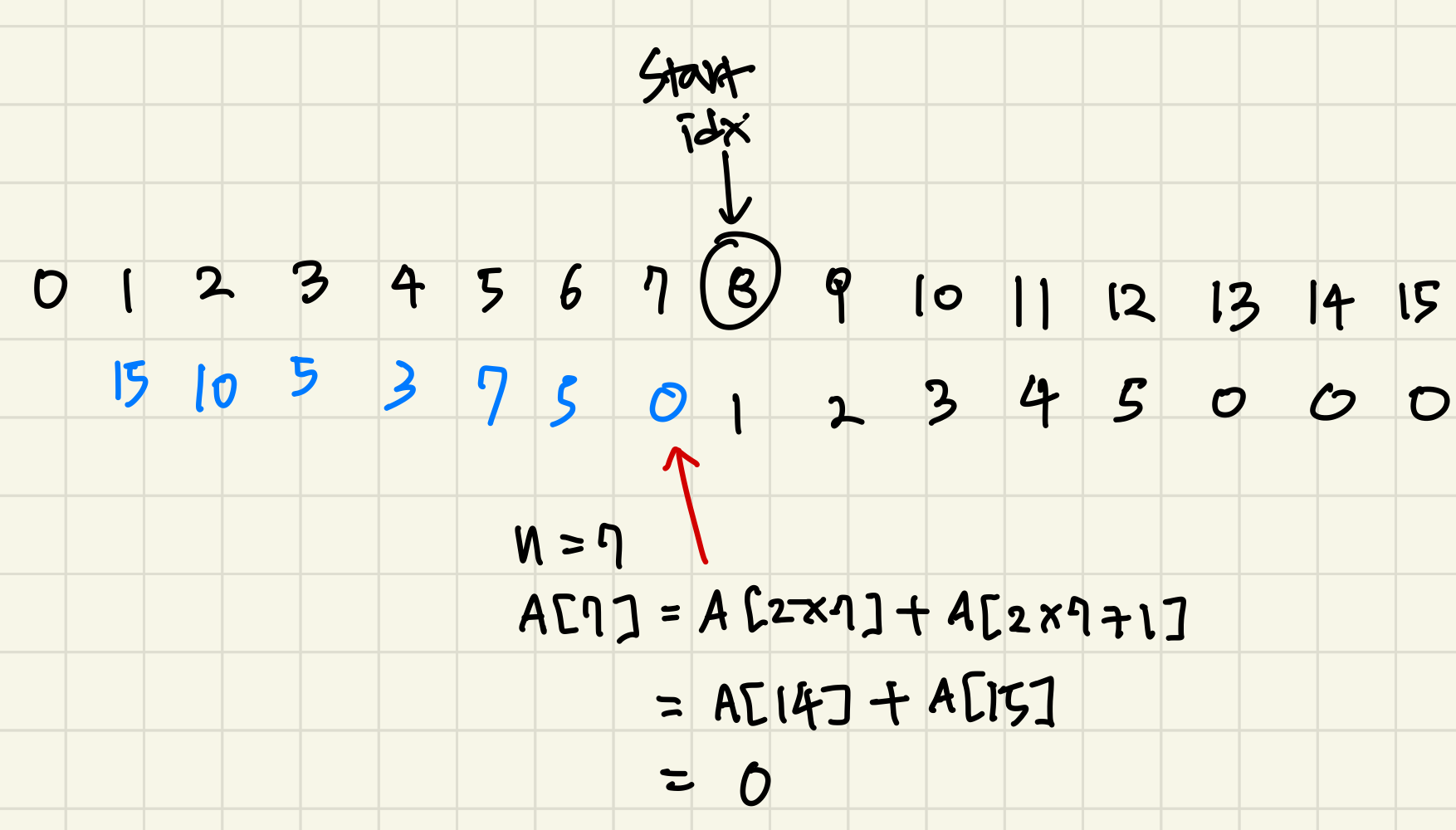 0부터 시작해서 15까지 트리 배열의 크기만큼 트리 값을 초기화 한다. 리프노드의 시작위치 - 1 인덱스부터 1번 방향으로 트리 배열의 값을 채워나가도록 한다. 7번부터 1번까지 노드의 값을 채우는데, 자식 노드의 인덱스는 이진 트리 형식이므로 2n, 2n+1이 된다. (위의 입력값인 N과 혼동 X)