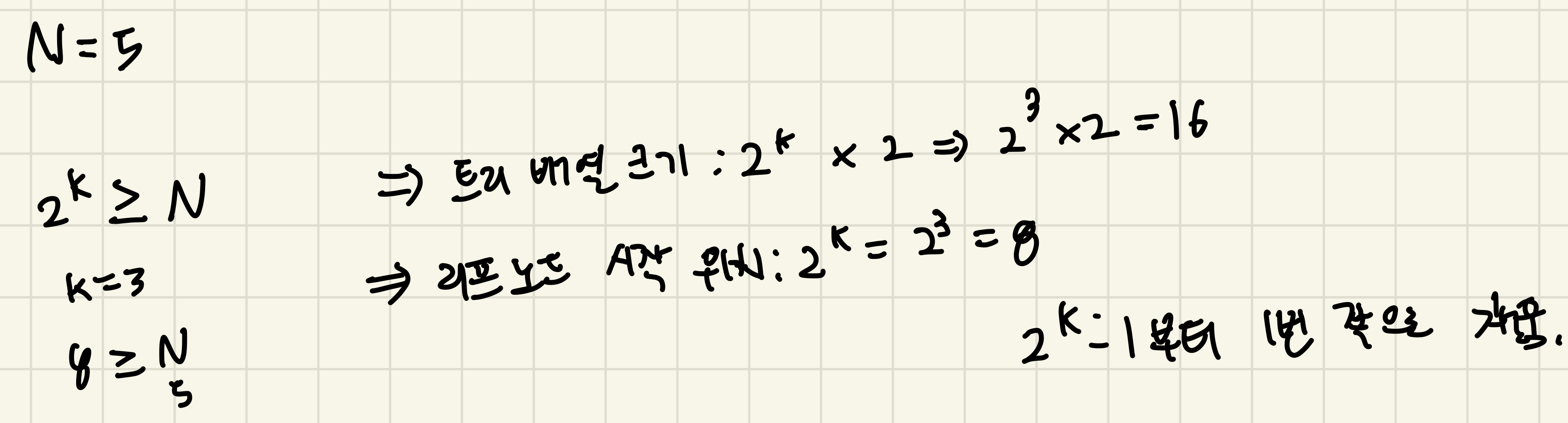 리프 노드의 개수가 데이터의 개수(N) 이상이 되도록 트리 배열을 만든다.