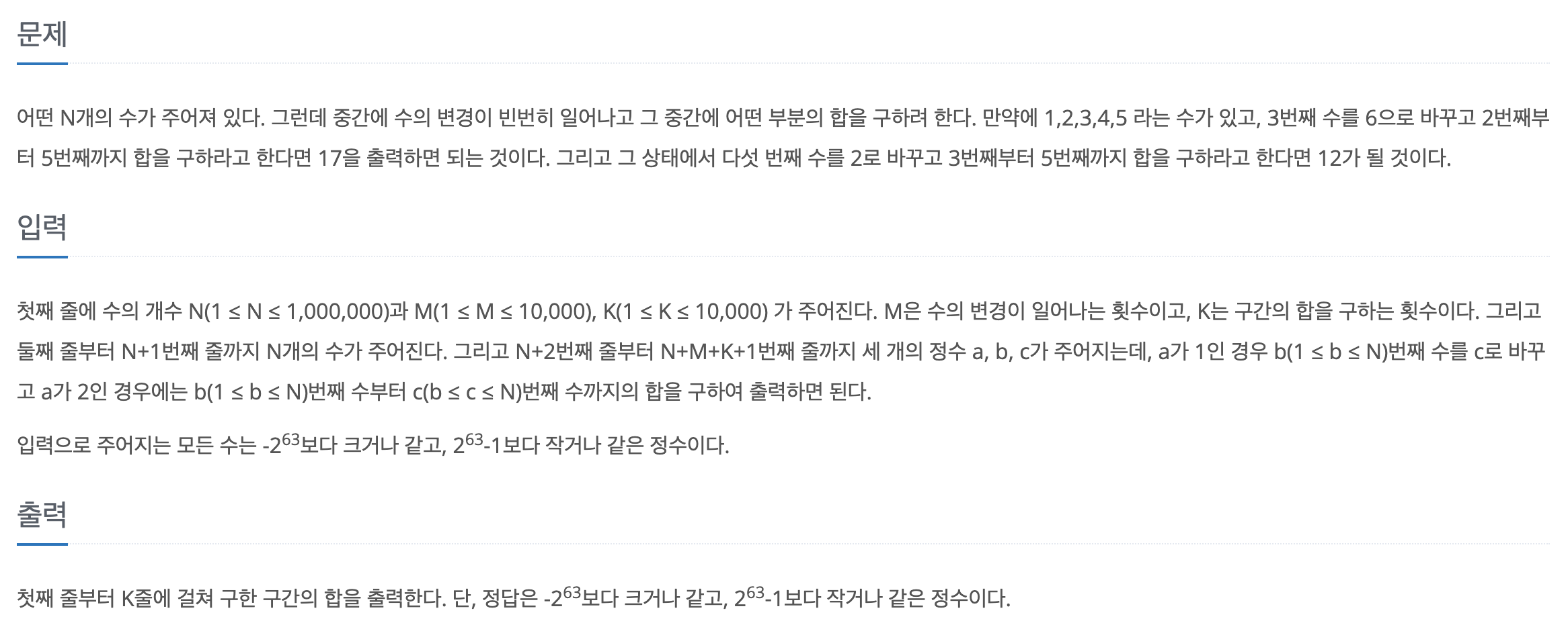 구간 합 구하는 방법은 합 배열의 개념을 이용해서 해결할 수 있으나 이번 문제와 같은 경우, 중간 중간 수가 자주 변경되는 상황이 일어나기 때문에 합 배열로 풀기에는 시간이 오래 걸린다는 단점이 있다. 그렇기에 이와 같은 문제는 세그먼트 트리를 이용해 풀이하는 것이 권장된다.