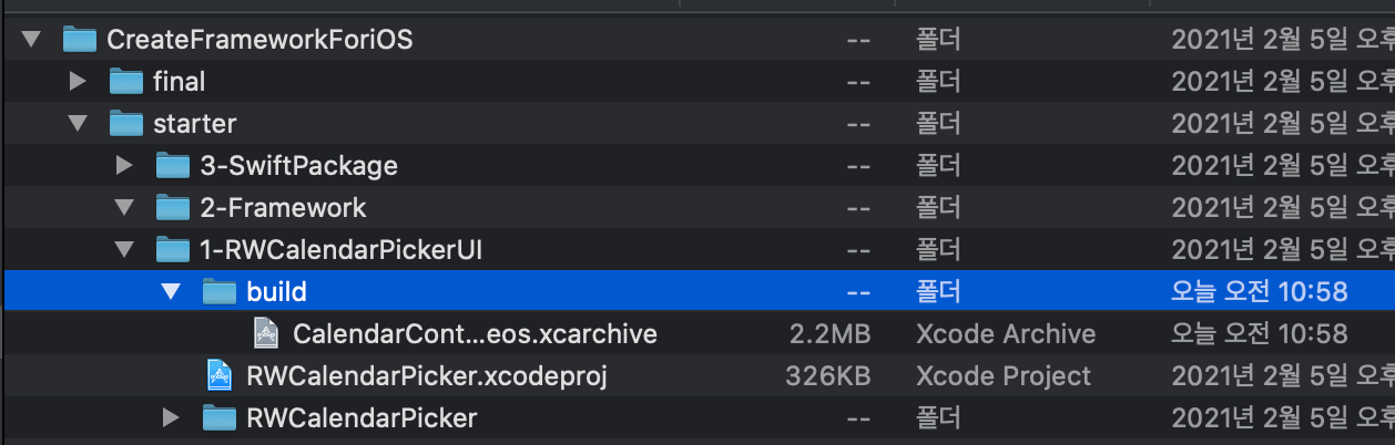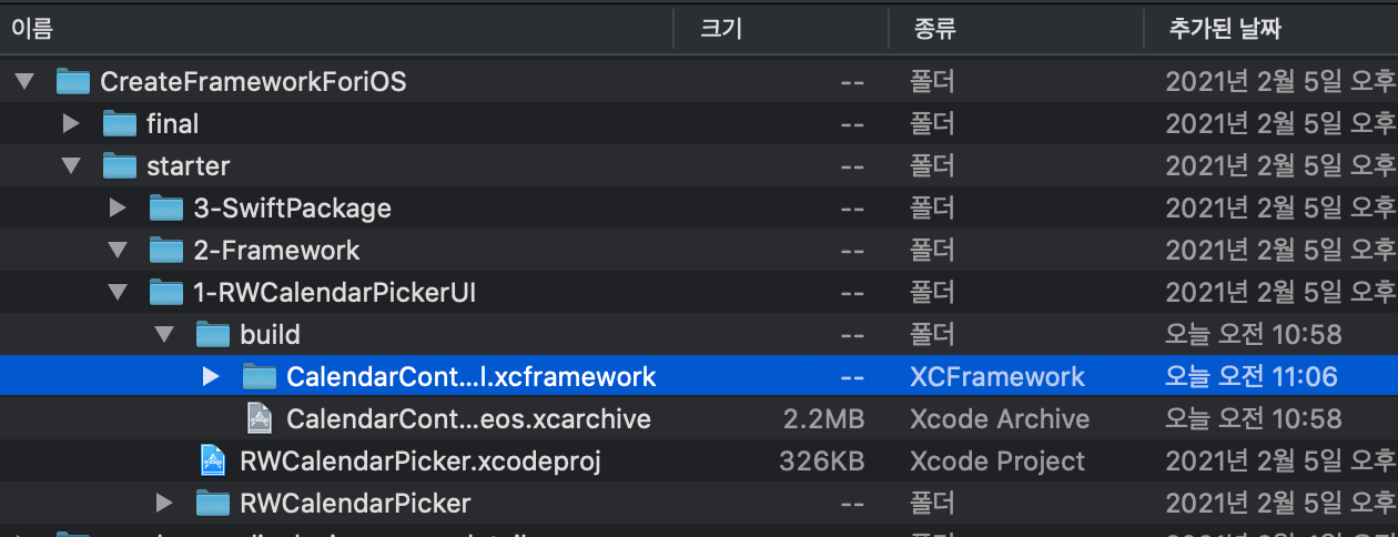위 명령어 실행 후, 이전 단계에서 생성된 아카이브 파일 경로와 같은 곳에 xcframework 폴더가 생성된 것을 확인할 수 있다.