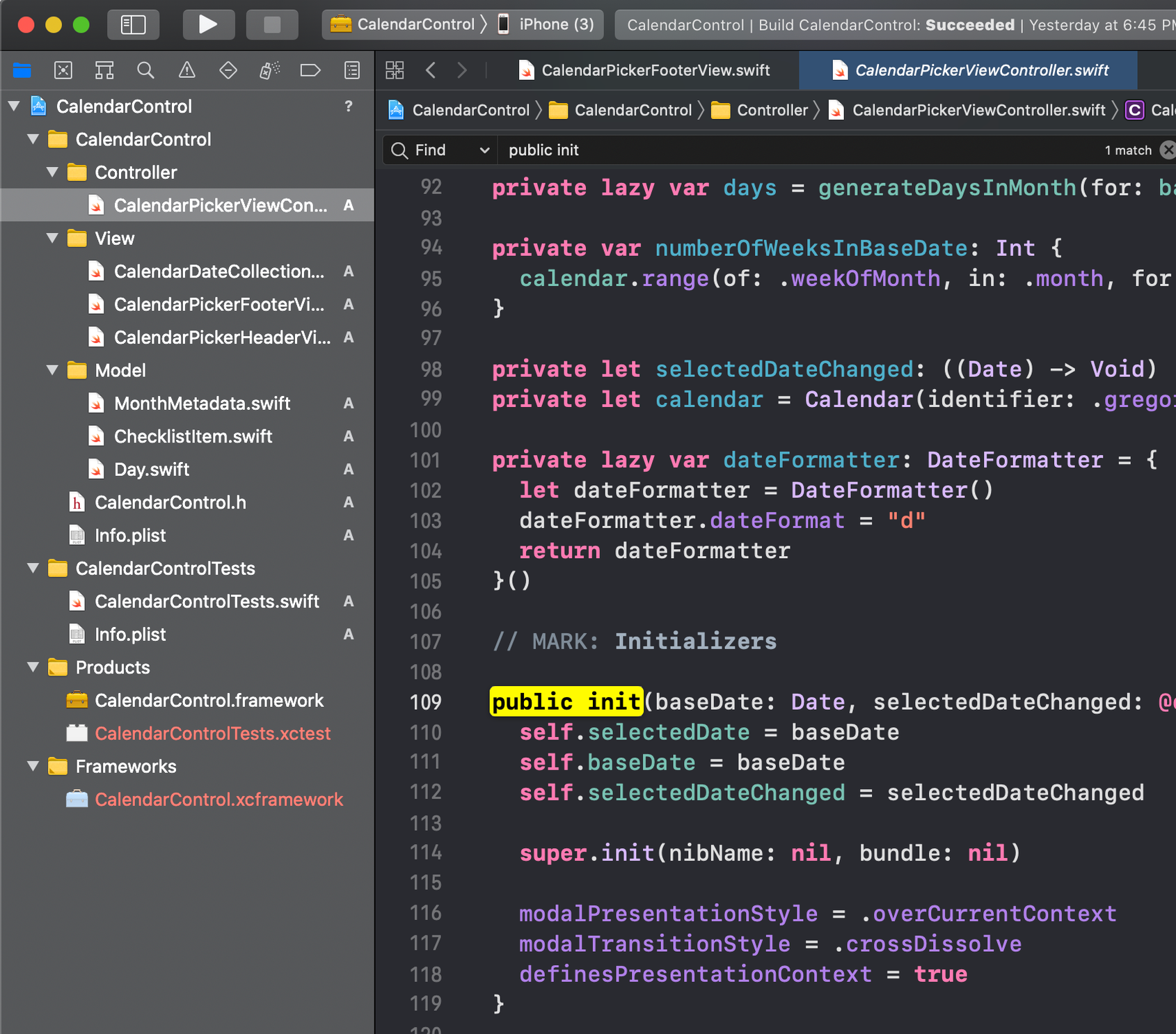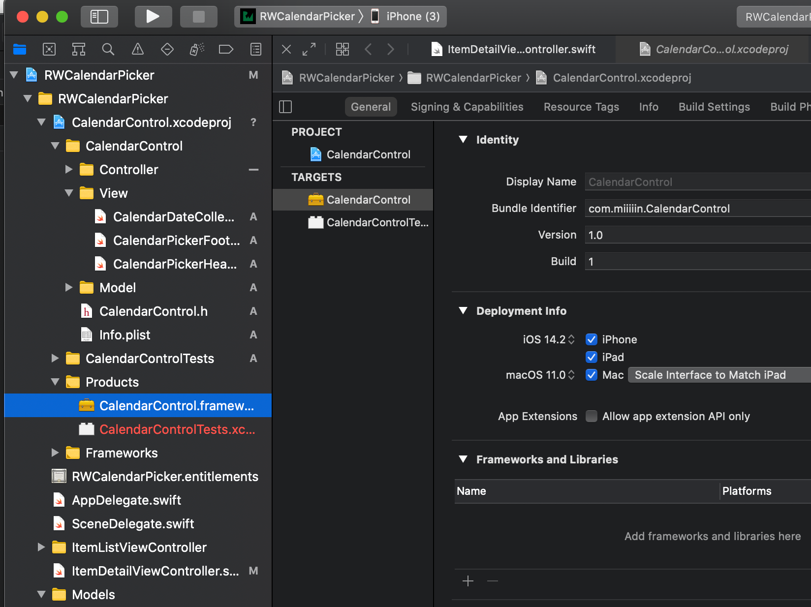 먼저 XCFramework 배포를 위한 swift package가 있어야 한다. 프로젝트 내에 Package.swift 파일을 하나 생성해준다. Package 클래스는 swift package의 매니페스트이다. CalendarControl 프레임워크를 스위프트 패키지로 만드려면 다음 파일의 수정이 필요하다.