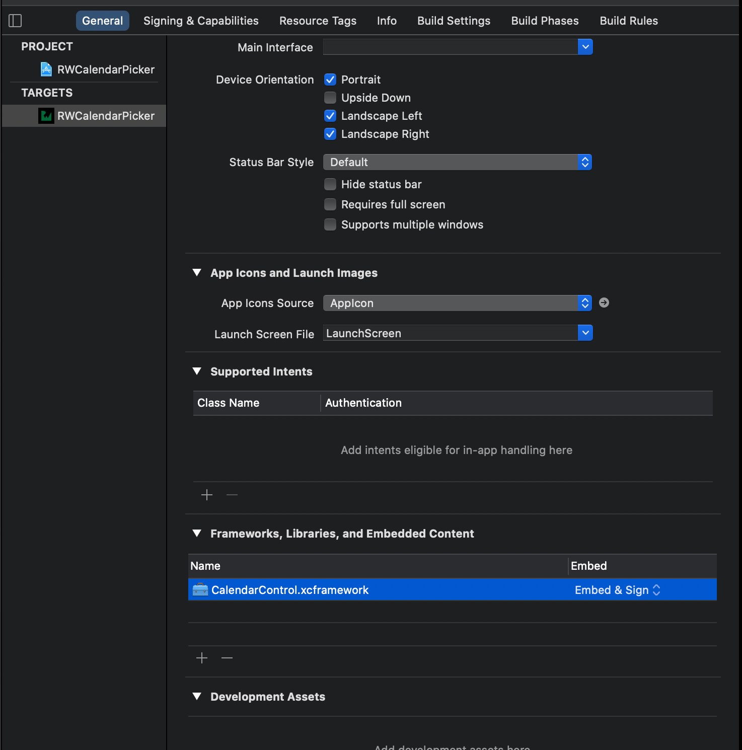 xcframework를 project target → General → Frameworks, Libraries, and Embedded Content 섹션으로 드래그하여 추가시킨다.