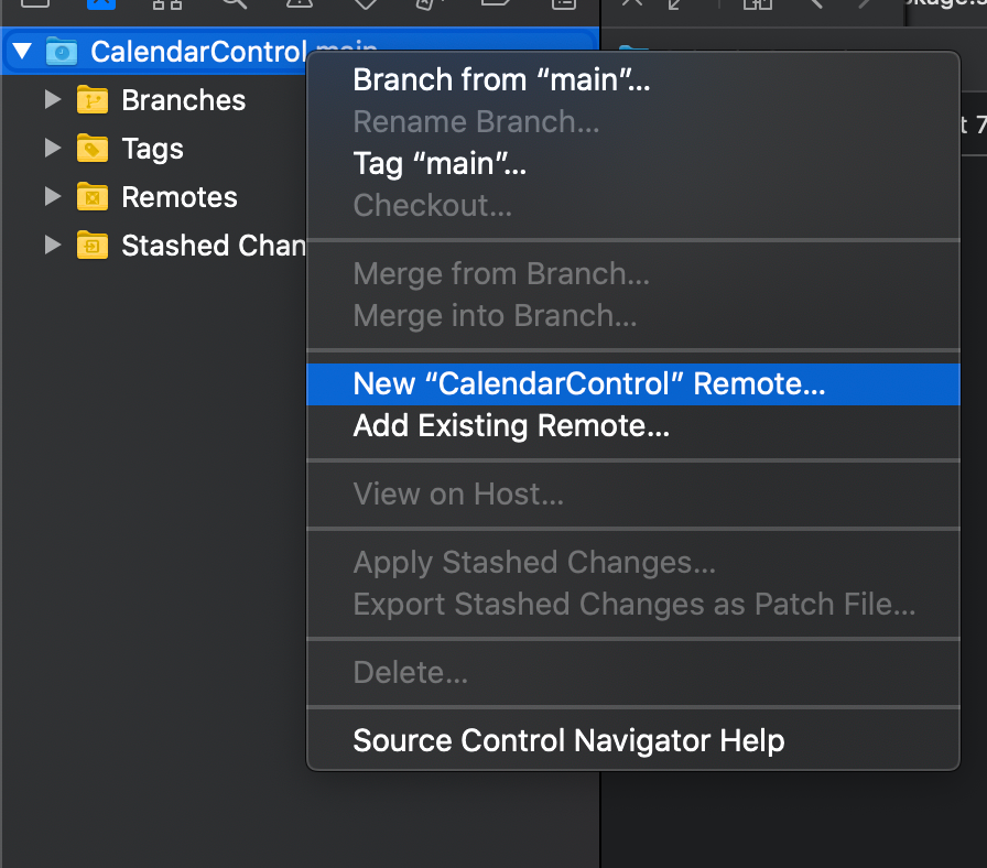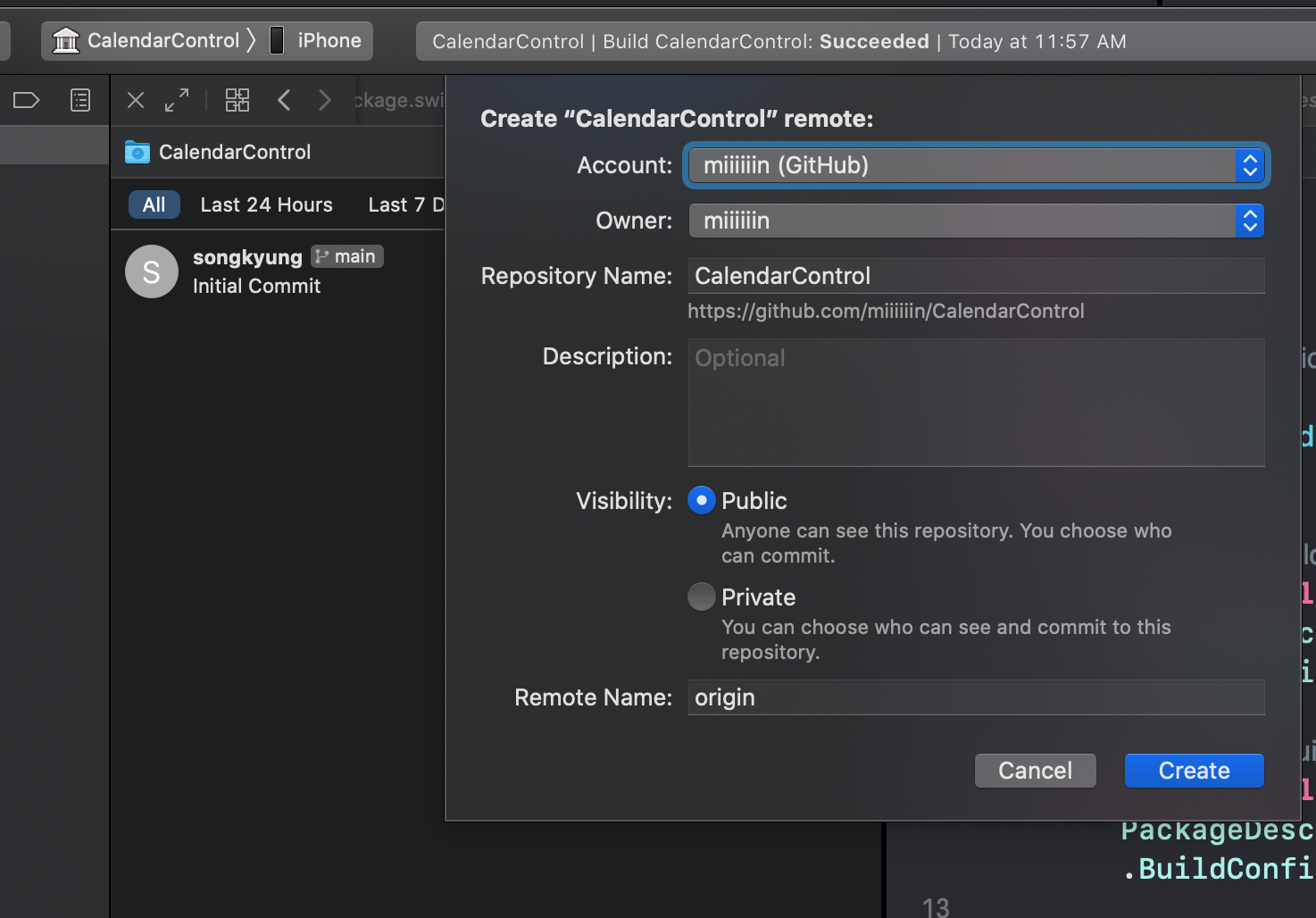 소스 제어 탐색기를 열고 해당 패키지를 선택하여 New “ClendarControl” Remote…를 선택한다. 가시성을 비공개로 변경하거나 기본 설정을 수정할 수 있다.