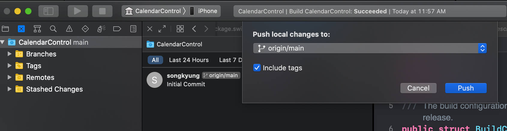 Xcode 메뉴 → 소스 제어 → push를 선택하여 해당 리포지토리에 푸시를 해준다. 태그 포함 설정도 체크하여 패키지의 버전 1.0.0이 활성화되도록 해준다.
