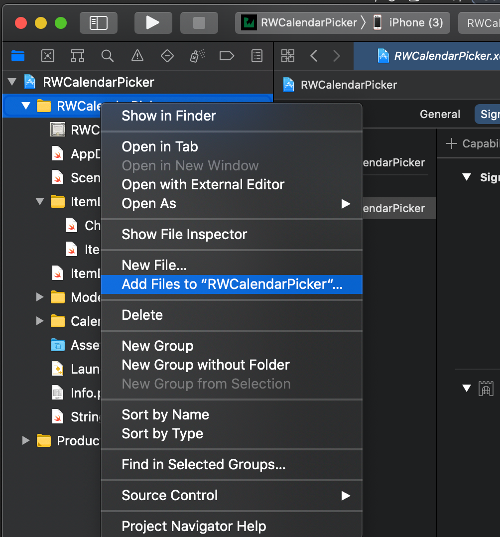- 샘플앱에서 Add files to …를 선택하여 해당 프레임워크 경로의 프로젝트를 추가한다.