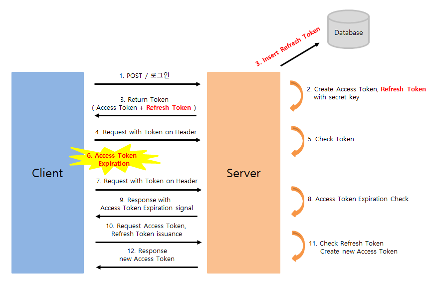 - Access Token이 만료되면, 클라이언트가 Refresh Token을 이용해 새 Access Token을 요청