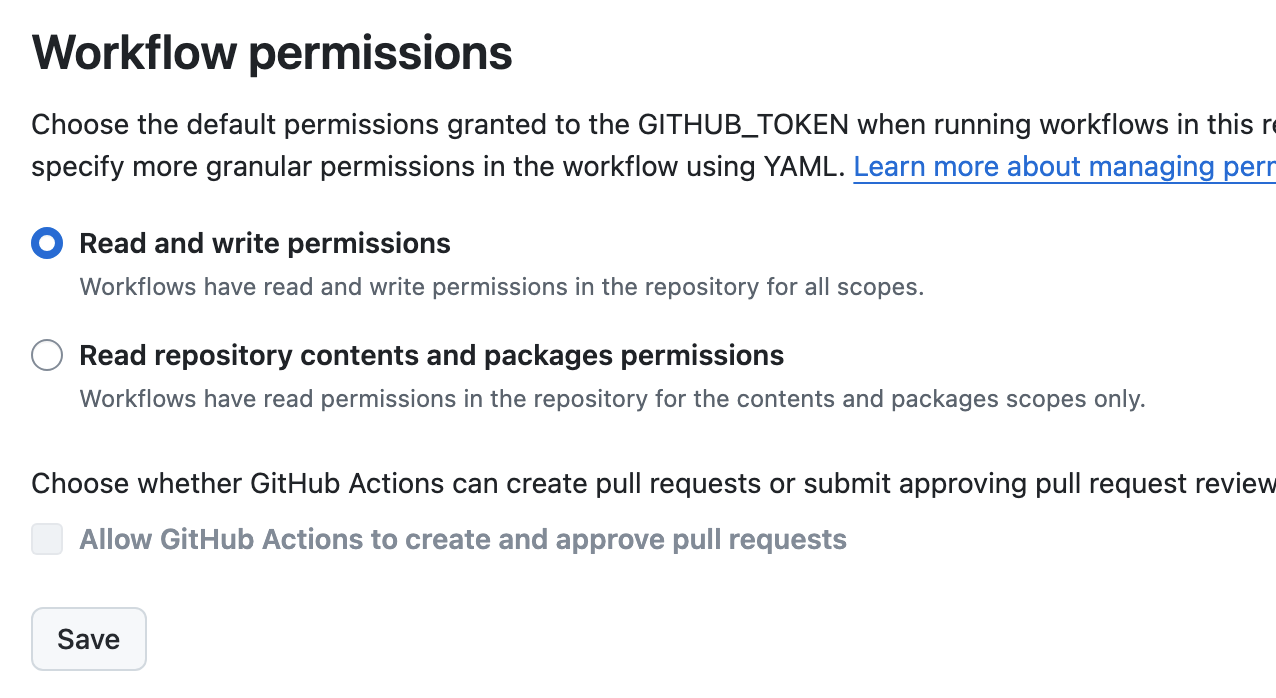 프로젝트의 Settings->Actions->General에 있는 워크플로우 허용을 Read and Write Permission으로 수정해준다.